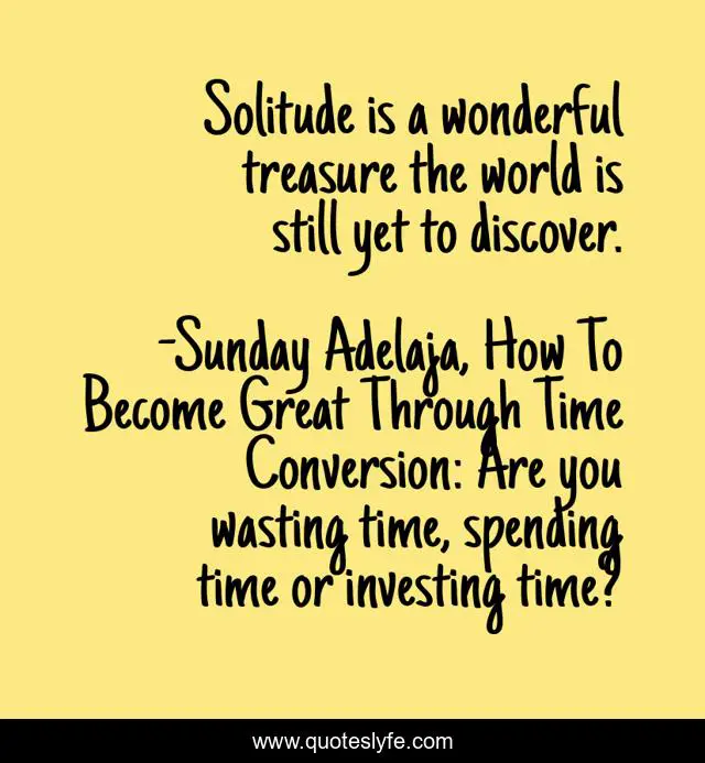 This page presents the quote "Solitude is a wonderful treasure the world is still yet to discover.". Author of this quote is Sunday Adelaja, How To Become Great Through Time Conversion: Are you wasting time, spending time or investing time?. This quote is about solitude, life, conversion, productivity, wealth, treasure, greatness, waste, humanity,.