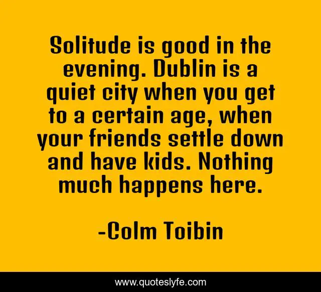 This page presents the quote "Solitude is good in the evening. Dublin is a quiet city when you get to a certain age, when your friends settle down and have kids. Nothing much happens here.". Author of this quote is Colm Toibin. This quote is about city, good, friends,.