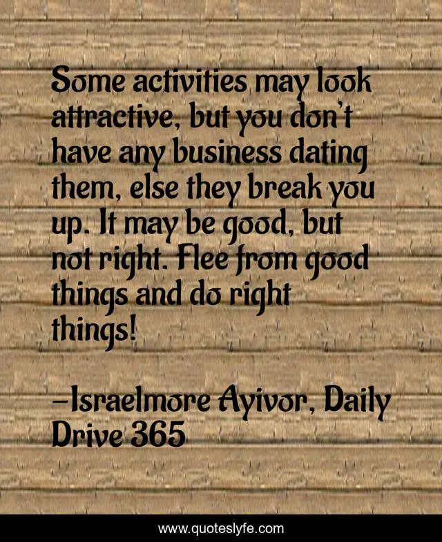 This page presents the quote "Some activities may look attractive, but you don’t have any business dating them, else they break you up. It may be good, but not right. Flee from good things and do right things!". Author of this quote is Israelmore Ayivor, Daily Drive 365. This quote is about food-for-thought, right, business, right-things, attract, good, act-right, attractive, activity,.