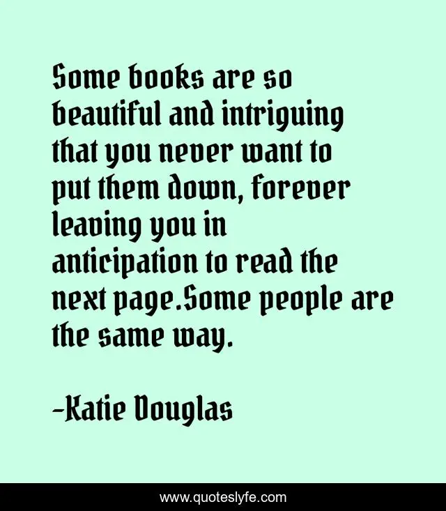 This page presents the quote "Some books are so beautiful and intriguing that you never want to put them down, forever leaving you in anticipation to read the next page.Some people are the same way.". Author of this quote is Katie Douglas. This quote is about beautiful, books, love, affection, people,.
