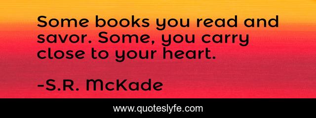 This page presents the quote "Some books you read and savor. Some, you carry close to your heart.". Author of this quote is S.R. McKade. This quote is about book-lovers-addiction, bookworms, book, books, book-lovers,.