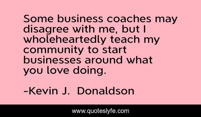 This page presents the quote "Some business coaches may disagree with me, but I wholeheartedly teach my community to start businesses around what you love doing.". Author of this quote is Kevin J. Donaldson. This quote is about business, love-what-you-do, success,.