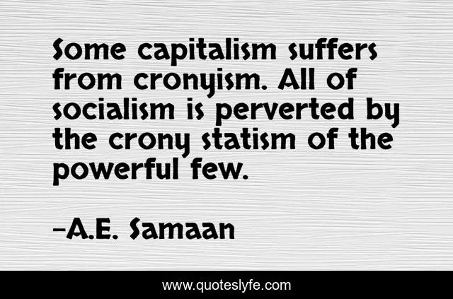 This page presents the quote "Some capitalism suffers from cronyism. All of socialism is perverted by the crony statism of the powerful few.". Author of this quote is A.E. Samaan. This quote is about cronyism, libertarianism, statism, centrally-planned-societies, liberty, capitalism, socialism, statist, capitalist,.