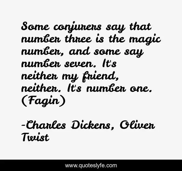 This page presents the quote "Some conjurers say that number three is the magic number, and some say number seven. It's neither my friend, neither. It's number one. (Fagin)". Author of this quote is Charles Dickens, Oliver Twist. .