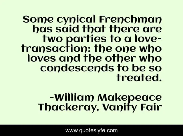 This page presents the quote "Some cynical Frenchman has said that there are two parties to a love-transaction: the one who loves and the other who condescends to be so treated.". Author of this quote is William Makepeace Thackeray, Vanity Fair. This quote is about relationships, love, affection,.