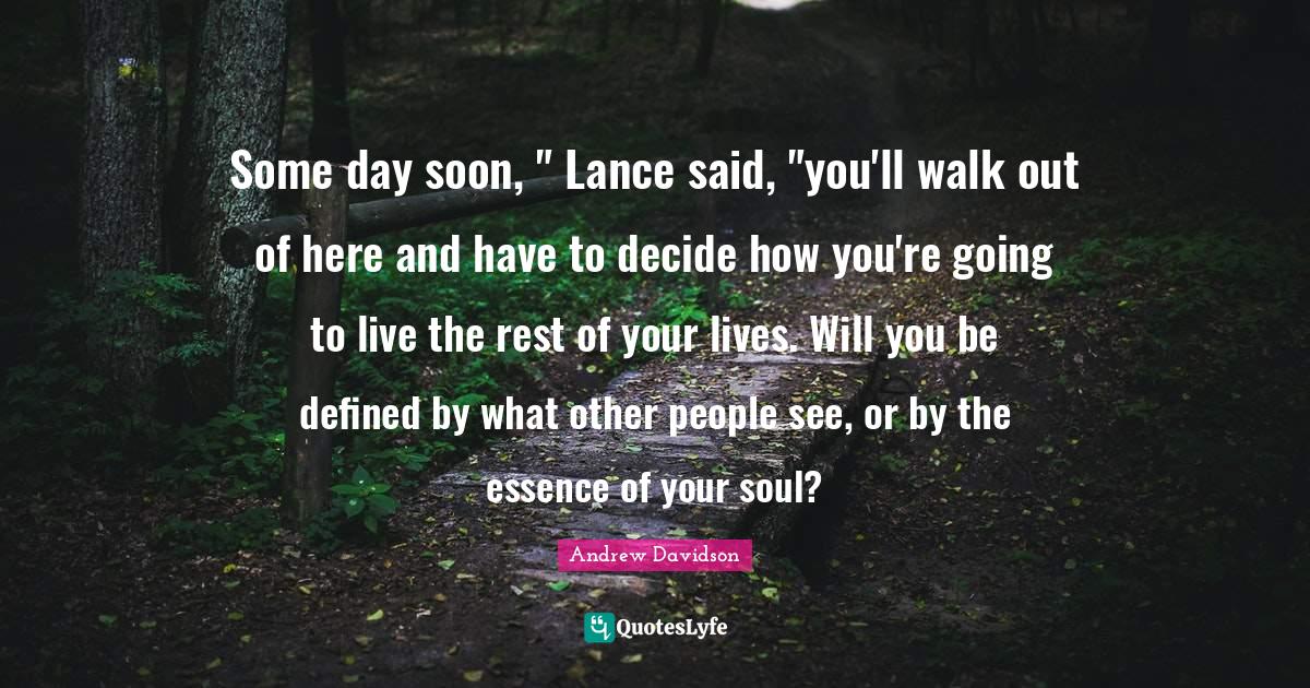 This page presents the quote "Some day soon, " Lance said, "you'll walk out of here and have to decide how you're going to live the rest of your lives. Will you be defined by what other people see, or by the essence of your soul?". Author of this quote is Andrew Davidson. .