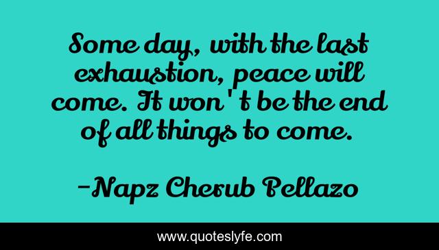 This page presents the quote "Some day, with the last exhaustion, peace will come. It won't be the end of all things to come.". Author of this quote is Napz Cherub Pellazo. This quote is about life, peace-of-mind, end-of-the-world, inspirational, enthusiasm, exhaustion,.