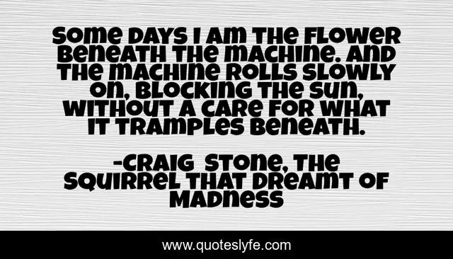 This page presents the quote "Some days I am the flower beneath the machine. And the machine rolls slowly on, blocking the sun, without a care for what it tramples beneath.". Author of this quote is Craig Stone, The Squirrel that Dreamt of Madness. This quote is about life, poverty-humannature, depression, homelessness,.