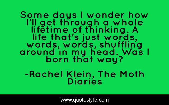This page presents the quote "Some days I wonder how I'll get through a whole lifetime of thinking. A life that's just words, words, words, shuffling around in my head. Was I born that way?". Author of this quote is Rachel Klein, The Moth Diaries. This quote is about thinking, words,.