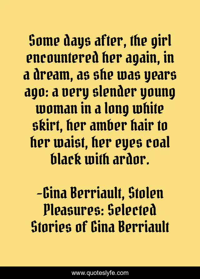 This page presents the quote "Some days after, the girl encountered her again, in a dream, as she was years ago: a very slender young woman in a long white skirt, her amber hair to her waist, her eyes coal black with ardor.". Author of this quote is Gina Berriault, Stolen Pleasures: Selected Stories of Gina Berriault. This quote is about hair, eyes, woman, beauty, youth, girl, dream,.