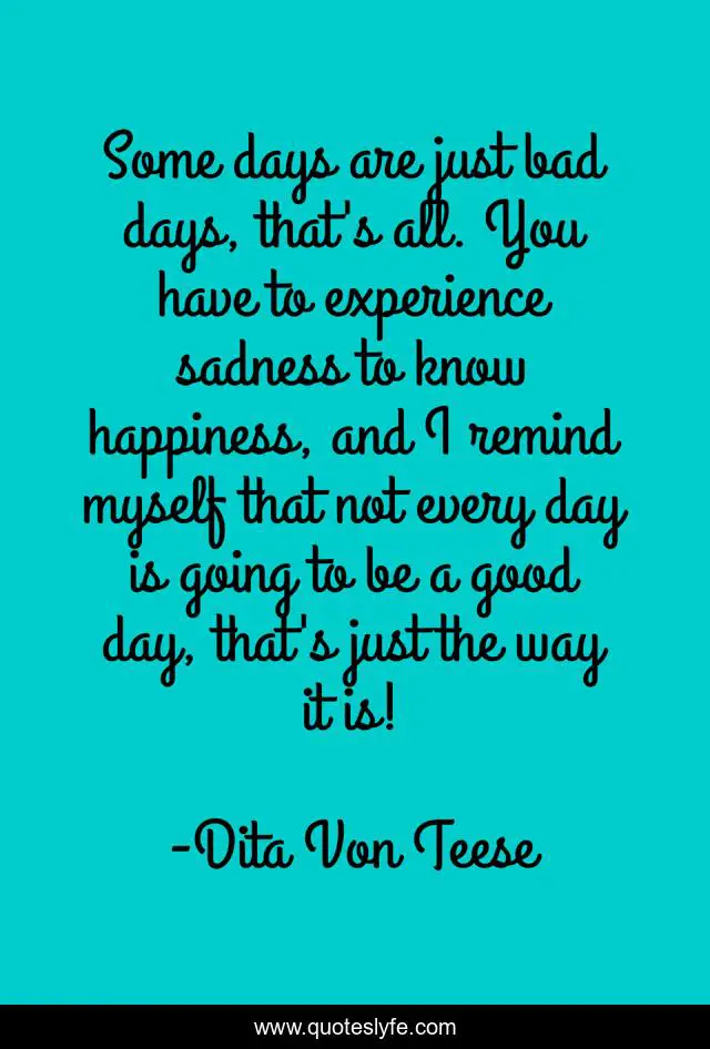 This page presents the quote "Some days are just bad days, that's all. You have to experience sadness to know happiness, and I remind myself that not every day is going to be a good day, that's just the way it is!". Author of this quote is Dita Von Teese. This quote is about good, experience, sad,.