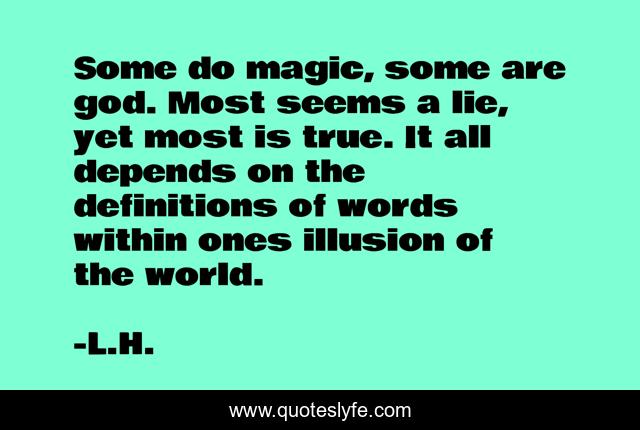 This page presents the quote "Some do magic, some are god. Most seems a lie, yet most is true. It all depends on the definitions of words within ones illusion of the world.". Author of this quote is L.H.. This quote is about definition, reality-view, magic, viewpoint, god, magick, word-definition, illusion,.