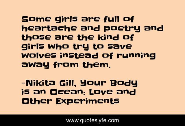 This page presents the quote "Some girls are full of heartache and poetry and those are the kind of girls who try to save wolves instead of running away from them.". Author of this quote is Nikita Gill, Your Body is an Ocean: Love and Other Experiments. This quote is about heartache, love, poetry, wolves, save, affection,.