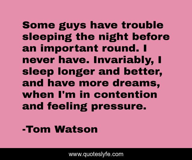 This page presents the quote "Some guys have trouble sleeping the night before an important round. I never have. Invariably, I sleep longer and better, and have more dreams, when I'm in contention and feeling pressure.". Author of this quote is Tom Watson. This quote is about pressure, sleep, night,.