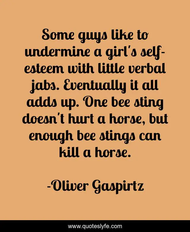 This page presents the quote "Some guys like to undermine a girl's self-esteem with little verbal jabs. Eventually it all adds up. One bee sting doesn't hurt a horse, but enough bee stings can kill a horse.". Author of this quote is Oliver Gaspirtz. This quote is about horses, relationships, self-confidence, girls, insults, guys-and-their-dumb-ways, bees, guys, verbal-abuse,.