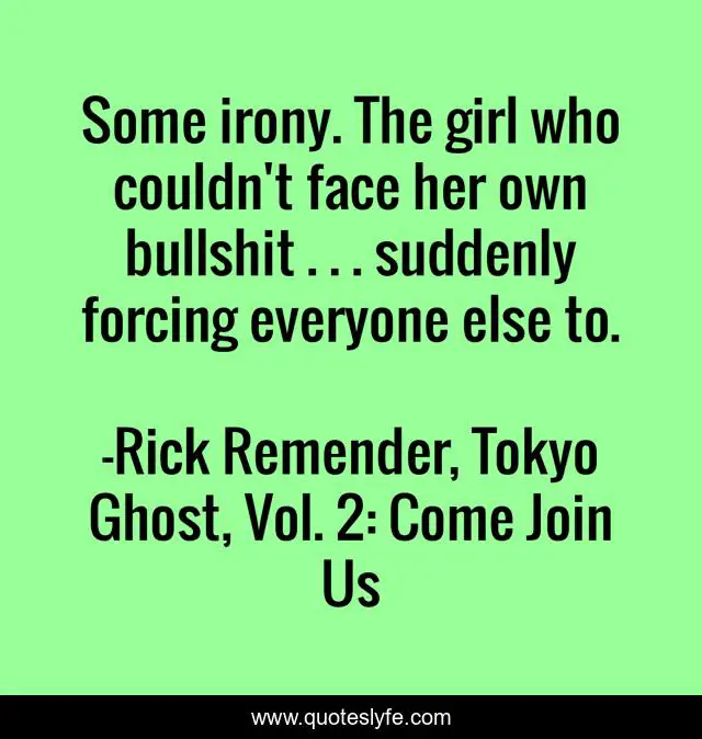 This page presents the quote "Some irony. The girl who couldn't face her own bullshit . . . suddenly forcing everyone else to.". Author of this quote is Rick Remender, Tokyo Ghost, Vol. 2: Come Join Us. This quote is about irony, debbie-decay, rick-remender, bullshit, tokyo-ghost,.