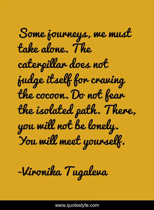This page presents the quote "Some journeys, we must take alone. The caterpillar does not judge itself for craving the cocoon. Do not fear the isolated path. There, you will not be lonely. You will meet yourself.". Author of this quote is Vironika Tugaleva. This quote is about alone, aloneness, isolated-path, self-awareness, isolated,.
