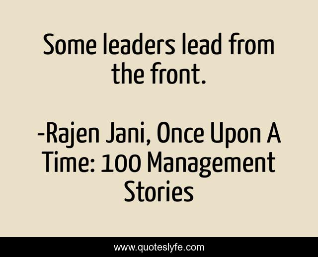 This page presents the quote "Some leaders lead from the front.". Author of this quote is Rajen Jani, Once Upon A Time: 100 Management Stories. This quote is about motivation, communication, sales, anger, improvement, quality, management, knowledge, strategy,.