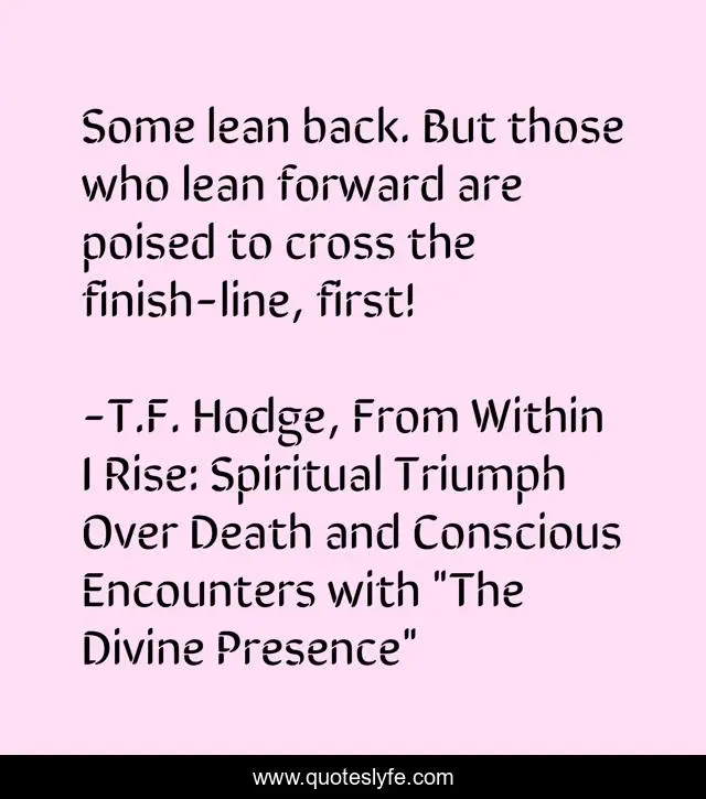 This page presents the quote "Some lean back. But those who lean forward are poised to cross the finish-line, first!". Author of this quote is T.F. Hodge, From Within I Rise: Spiritual Triumph Over Death and Conscious Encounters with "The Divine Presence". This quote is about perseverance, determination, goals, quotes, winning,.