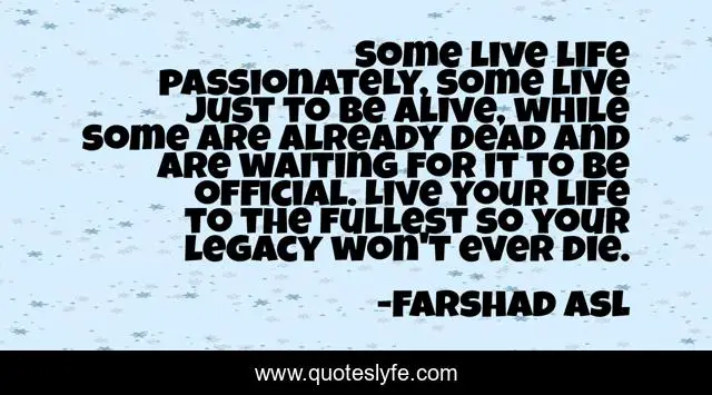 This page presents the quote "Some live life passionately, some live just to be alive, while some are already dead and are waiting for it to be official. Live your life to the fullest so your legacy won't ever die.". Author of this quote is Farshad Asl. This quote is about passionately, life, legacy, live,.