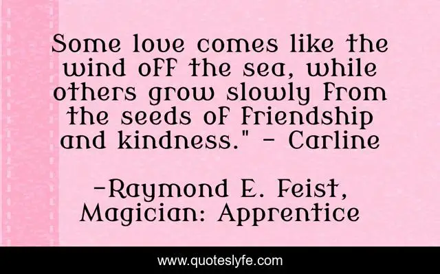 This page presents the quote "Some love comes like the wind off the sea, while others grow slowly from the seeds of friendship and kindness." - Carline". Author of this quote is Raymond E. Feist, Magician: Apprentice. This quote is about friendzone, love, love-at-first-sight, kindness, friendship, affection,.