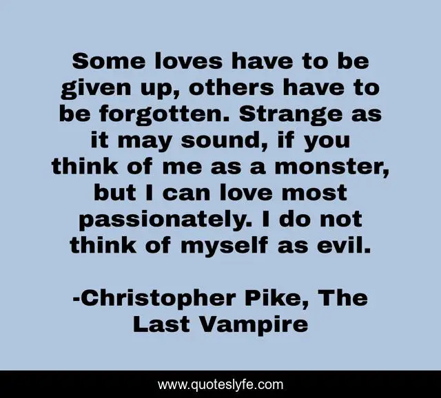 This page presents the quote "Some loves have to be given up, others have to be forgotten. Strange as it may sound, if you think of me as a monster, but I can love most passionately. I do not think of myself as evil.". Author of this quote is Christopher Pike, The Last Vampire. This quote is about evil, love, monsters, affection, vampires,.