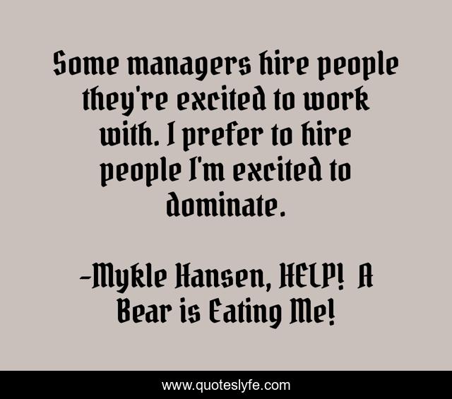 This page presents the quote "Some managers hire people they're excited to work with. I prefer to hire people I'm excited to dominate.". Author of this quote is Mykle Hansen, HELP! A Bear is Eating Me!. .