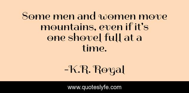 This page presents the quote "Some men and women move mountains, even if it's one shovel full at a time.". Author of this quote is K.R. Royal. This quote is about confidence, love, positive, motivational, optimistic, inspirational, enthusiasm, affection,.