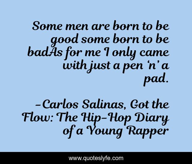 This page presents the quote "Some men are born to be good some born to be badAs for me I only came with just a pen ‘n’ a pad.". Author of this quote is Carlos Salinas, Got the Flow: The Hip-Hop Diary of a Young Rapper. This quote is about rap, rapping, rappers, rapper, poetry, writing, inspirational, authors, enthusiasm,.
