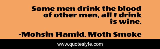 This page presents the quote "Some men drink the blood of other men, all I drink is wine.". Author of this quote is Mohsin Hamid, Moth Smoke. This quote is about sin, blood, wine,.
