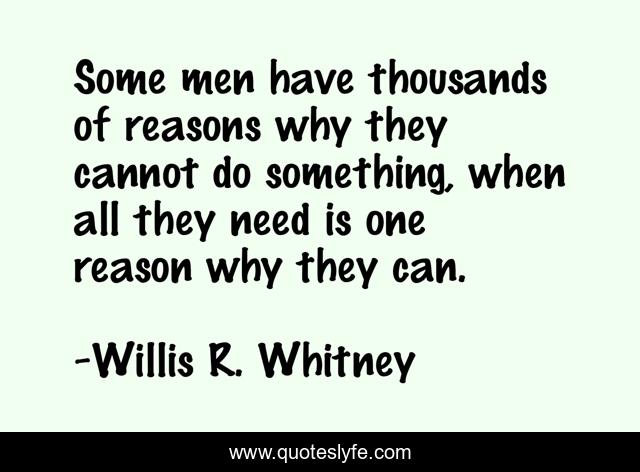This page presents the quote "Some men have thousands of reasons why they cannot do something, when all they need is one reason why they can.". Author of this quote is Willis R. Whitney. This quote is about excuses, motivation, reason, inspirational-motivational,.