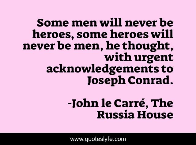 This page presents the quote "Some men will never be heroes, some heroes will never be men, he thought, with urgent acknowledgements to Joseph Conrad.". Author of this quote is John le Carré, The Russia House. This quote is about spy, heroes, conrad, espionage,.