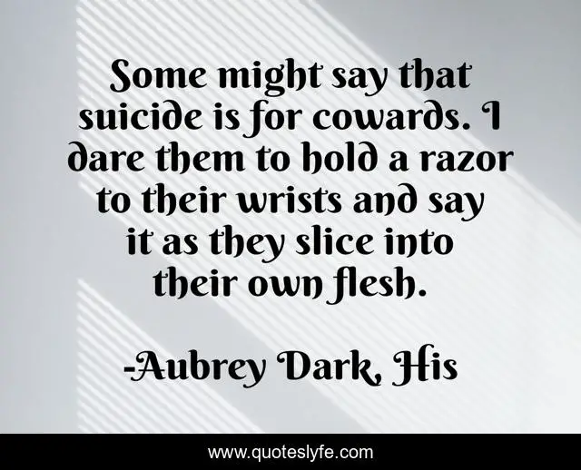 This page presents the quote "Some might say that suicide is for cowards. I dare them to hold a razor to their wrists and say it as they slice into their own flesh.". Author of this quote is Aubrey Dark, His. This quote is about life, death, pain, greif, loneliness, wisdom, sadness, suicide, fear,.