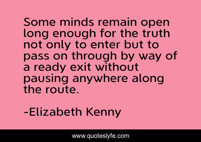 This page presents the quote "Some minds remain open long enough for the truth not only to enter but to pass on through by way of a ready exit without pausing anywhere along the route.". Author of this quote is Elizabeth Kenny. This quote is about ready, long, way,.