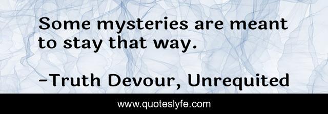 This page presents the quote "Some mysteries are meant to stay that way.". Author of this quote is Truth Devour, Unrequited. This quote is about faith, love, kindred-spirits, joy, karmic, soul, romance, twin-flames, sated,.