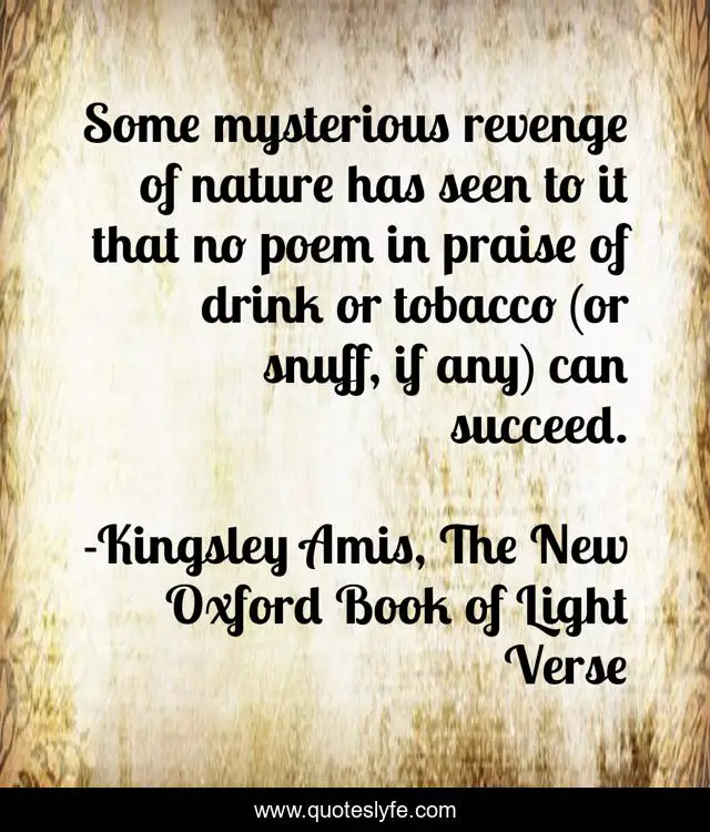 This page presents the quote "Some mysterious revenge of nature has seen to it that no poem in praise of drink or tobacco (or snuff, if any) can succeed.". Author of this quote is Kingsley Amis, The New Oxford Book of Light Verse. This quote is about snuff, alcohol, tobacco, poetry,.