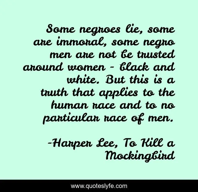 This page presents the quote "Some negroes lie, some are immoral, some negro men are not be trusted around women - black and white. But this is a truth that applies to the human race and to no particular race of men.". Author of this quote is Harper Lee, To Kill a Mockingbird. This quote is about race, racism, truth,.