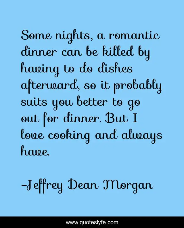 This page presents the quote "Some nights, a romantic dinner can be killed by having to do dishes afterward, so it probably suits you better to go out for dinner. But I love cooking and always have.". Author of this quote is Jeffrey Dean Morgan. This quote is about dinner, cooking, love, affection,.