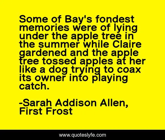 This page presents the quote "Some of Bay's fondest memories were of lying under the apple tree in the summer while Claire gardened and the apple tree tossed apples at her like a dog trying to coax its owner into playing catch.". Author of this quote is Sarah Addison Allen, First Frost. This quote is about first-frost, sarah-addison-allen, fall, waverleys,.