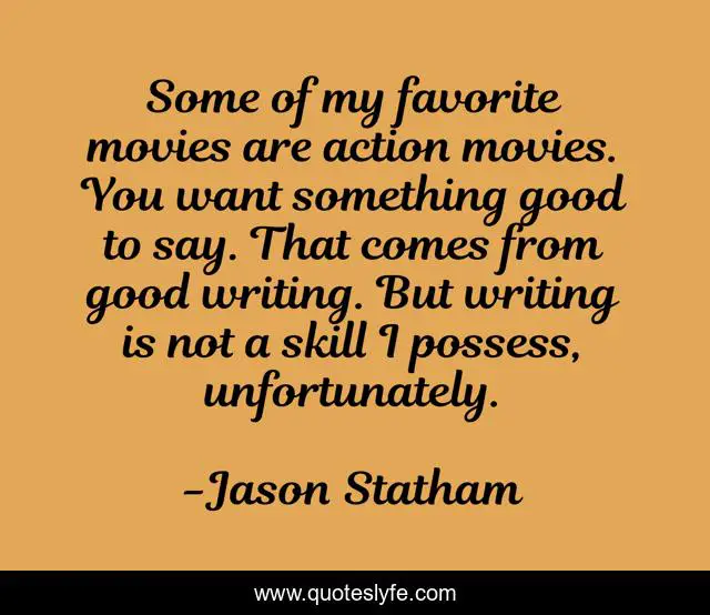 This page presents the quote "Some of my favorite movies are action movies. You want something good to say. That comes from good writing. But writing is not a skill I possess, unfortunately.". Author of this quote is Jason Statham. This quote is about action, good, writing,.
