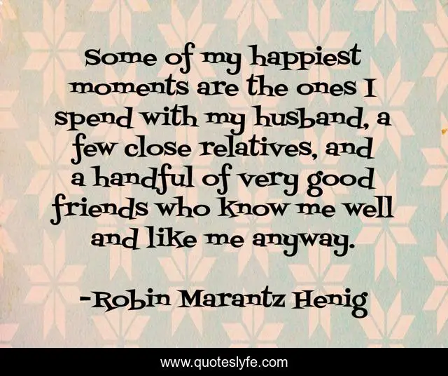 This page presents the quote "Some of my happiest moments are the ones I spend with my husband, a few close relatives, and a handful of very good friends who know me well and like me anyway.". Author of this quote is Robin Marantz Henig. This quote is about me, moments, friends,.