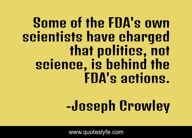 This page presents the quote "Some of the FDA's own scientists have charged that politics, not science, is behind the FDA's actions.". Author of this quote is Joseph Crowley. This quote is about science, behind, actions,.