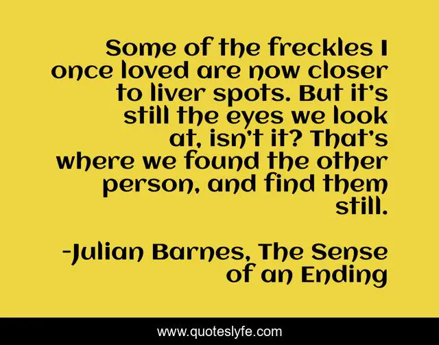 This page presents the quote "Some of the freckles I once loved are now closer to liver spots. But it’s still the eyes we look at, isn’t it? That’s where we found the other person, and find them still.". Author of this quote is Julian Barnes, The Sense of an Ending. This quote is about love, habit, familiarity, long-term-relationships, contentment, boredom, marriage, affection,.