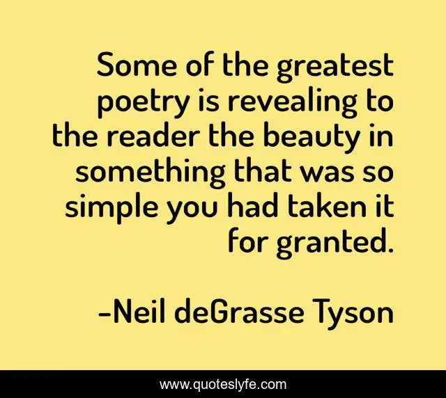This page presents the quote "Some of the greatest poetry is revealing to the reader the beauty in something that was so simple you had taken it for granted.". Author of this quote is Neil deGrasse Tyson. This quote is about simplicity, poetry, beauty, wonder,.