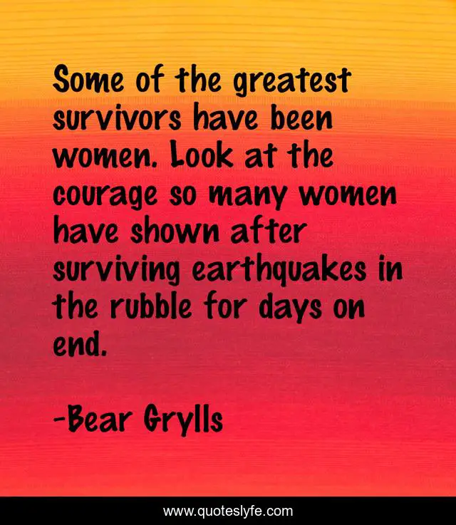 This page presents the quote "Some of the greatest survivors have been women. Look at the courage so many women have shown after surviving earthquakes in the rubble for days on end.". Author of this quote is Bear Grylls. This quote is about end, greatest, women,.