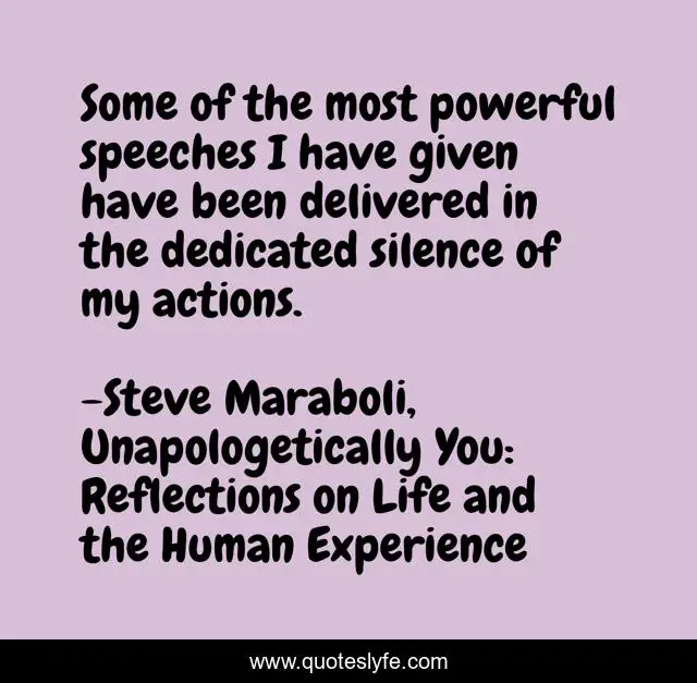 This page presents the quote "Some of the most powerful speeches I have given have been delivered in the dedicated silence of my actions.". Author of this quote is Steve Maraboli, Unapologetically You: Reflections on Life and the Human Experience. This quote is about dedicated, success, speeches, motivational, life, actions, optimistic, inspirational, positive,.