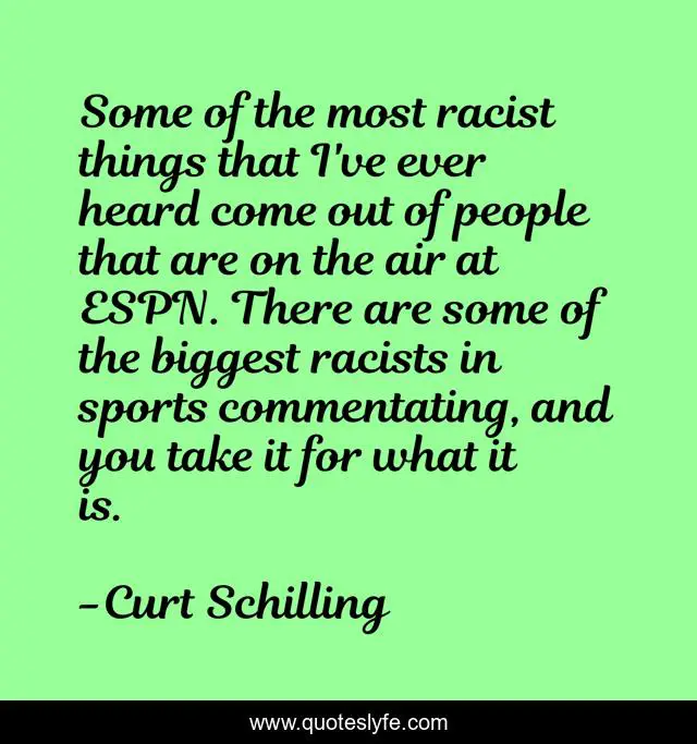 This page presents the quote "Some of the most racist things that I've ever heard come out of people that are on the air at ESPN. There are some of the biggest racists in sports commentating, and you take it for what it is.". Author of this quote is Curt Schilling. This quote is about people, air,.