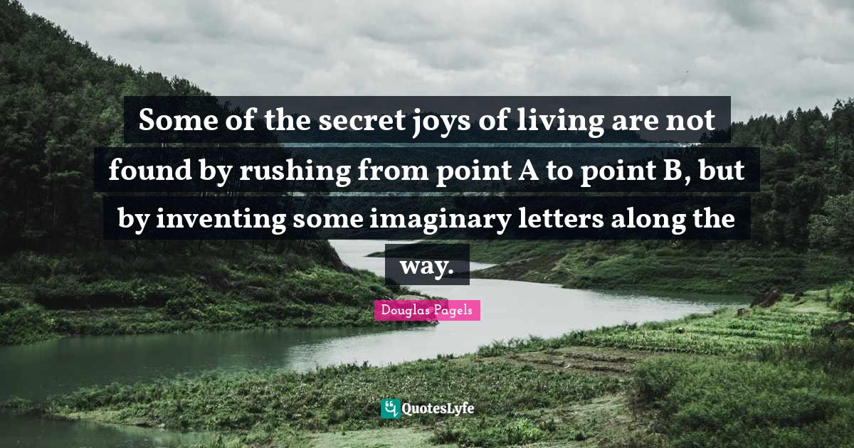 This page presents the quote "Some of the secret joys of living are not found by rushing from point A to point B, but by inventing some imaginary letters along the way.". Author of this quote is Douglas Pagels. This quote is about success, secret, way, letters, stress, found, inventing, imaginary, sarcastic,.