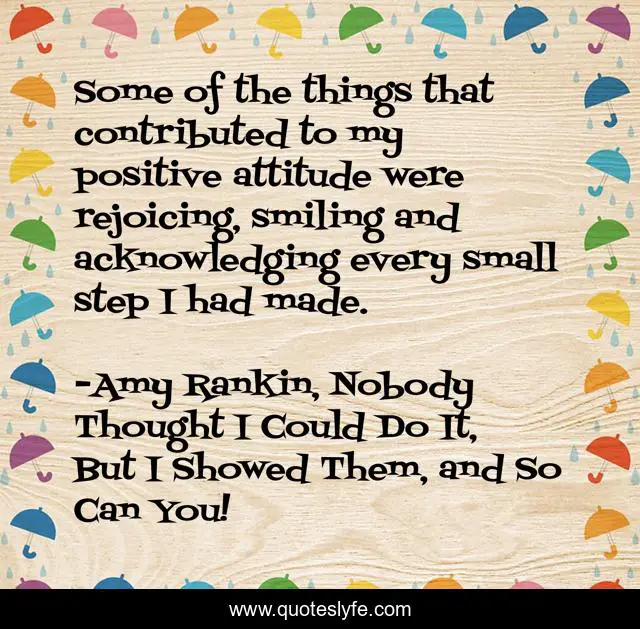 This page presents the quote "Some of the things that contributed to my positive attitude were rejoicing, smiling and acknowledging every small step I had made.". Author of this quote is Amy Rankin, Nobody Thought I Could Do It, But I Showed Them, and So Can You!. This quote is about positive, confidence,.