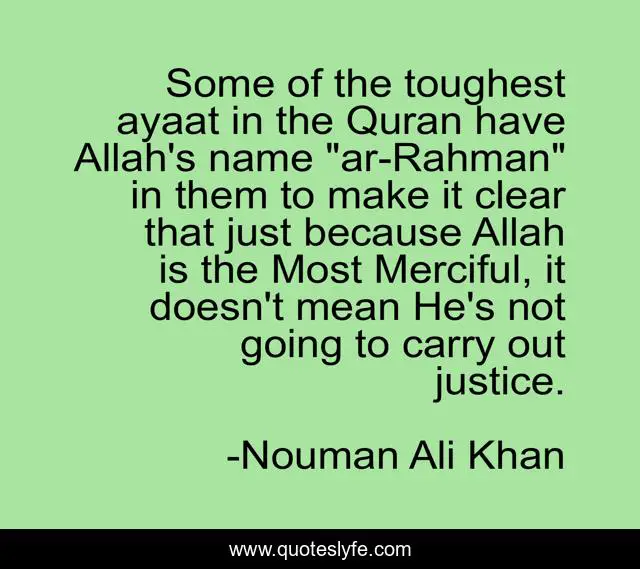 This page presents the quote "Some of the toughest ayaat in the Quran have Allah's name "ar-Rahman" in them to make it clear that just because Allah is the Most Merciful, it doesn't mean He's not going to carry out justice.". Author of this quote is Nouman Ali Khan. This quote is about justice, allah, islam,.